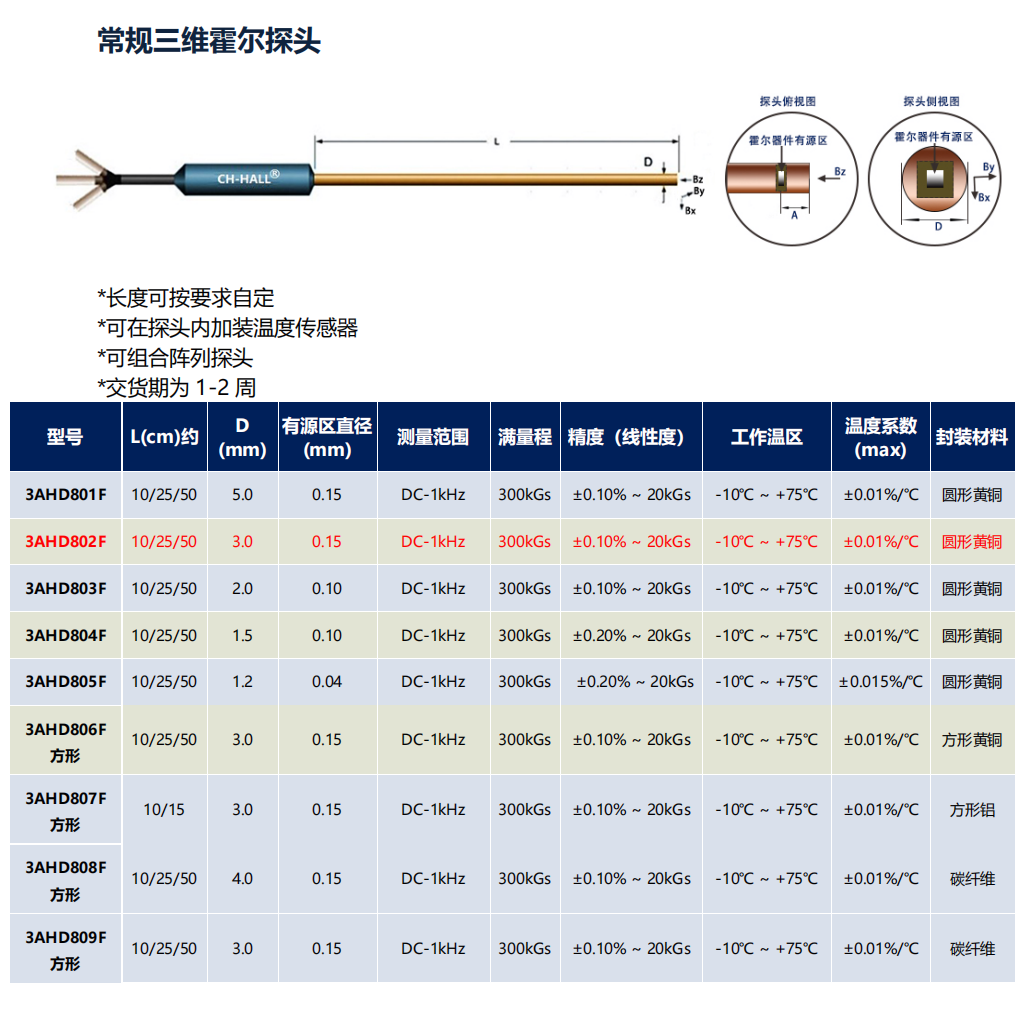 CH-63 型三維便攜式高斯計可以選配不同封裝及溫度范圍的三維、二維、一維高斯計探頭滿足各種測量場景要求。所有探頭均嚴格依據(jù) JJF1832-2020(1mT~2.5T)磁強計校準規(guī)范進行校準。